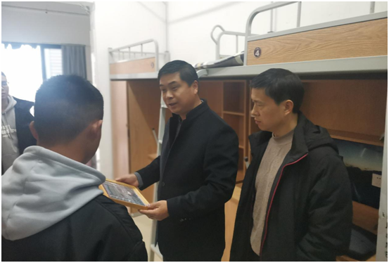 在学生公寓,程利群在访客本上登记姓名、仔细走访寝室。他认真了解学生对寝室热水、电器、直饮水等设施日常使用情况, 叮嘱学生重视疫情防控,做好自我防护,注意天气变化,做好防寒保暖,注意用电安全,提高防范意识和安全意识。希望同学们培养良好的学习习惯,在寝室里营造良好的学习氛围。