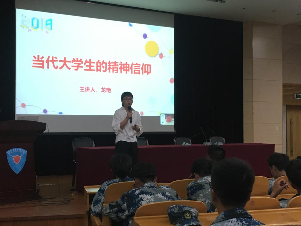 龙艳从简单的故事说起,从人类需要信仰吗?是否每个人都有信仰?宗教等于信仰吗?当代大学生到底应该有什么样的信仰?等问题入手,阐述了信仰的重要性,同时,通过宗教问题和当前的国际复杂形势问题进行分析,帮助大学生提高自身的意识形态辨识能力。号召全体新生建立马克思主义信仰观,以“中国梦”凝聚信仰,以“核心价值观”夯实信仰。