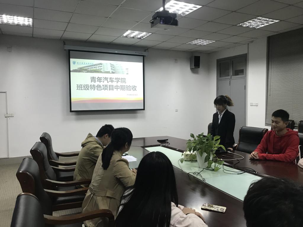 4月18日中午,青年汽车必赢线路检测3003no1对2017-2018年度的班级特色项目进行中期验收。学工办老师和学生会班级特色项目工作小组的学生干部聆听了各班的汇报。