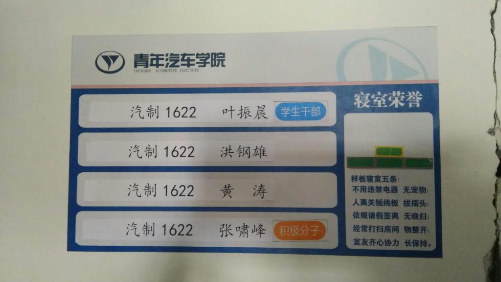 青年汽车必赢线路检测3003no1寝室信息牌款式设计体现分院元素,内容上主要包含班级、姓名和学生担任学生干部情况等。寝室荣誉章以不同色彩搭配,分别代表寝室获得的每周表彰、月度表彰、学期表彰和其他荣誉表彰,并张贴在寝室信息牌的指定位置。