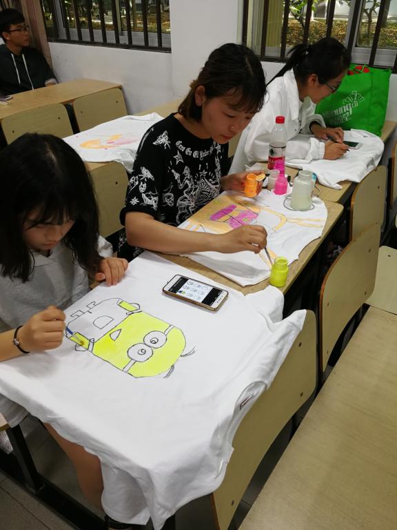 下午三点,活动预热准时开始。领到服装后,参与者于涂鸦区进行创意涂鸦。平日里投身于课堂、实训室的青年学子们在白T恤上肆意挥洒。童趣涂鸦、动漫人物、友情的亲密见证、个性logo标语,多姿多彩,张扬个性的涂鸦作品都应运而生。个性创作,颜料涂抹,活动还未正式开始,活动场地上已是一片绚丽的颜色海洋。