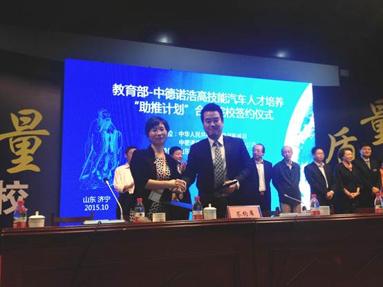 教育部一中德诺浩高技能汽车人才培养"助推计划"第二批合作院校项目启动与签约仪式于2015年10月19日在山东理工职业必赢线路检测3003no1举行。教育部职业教育与成人教育司白汉刚处长,中国职业技术教育学会刘占山秘书长等领导出席签约仪式。来自国家教育部、国家职业教育学会、合作签约的全国10所高职院校和30所中职学校,共600余人参加了大会。