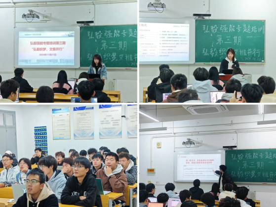 为促进学生全面发展,必赢线路检测3003no1弘毅社于2024年11月21日晚上18:30在必赢线路检测3003no1 2216教室举办了“弘毅强能”专题培训第三期——“弘毅织梦、文推并行”培训会。