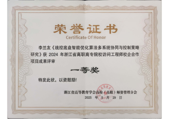 会议表彰了本届访问工程师校企合作优秀项目,在2024年结题的355项访问工程师项目评选中,经过严格遴选,网络评审,现场答辩,我院智能网联汽车技术专业李兰友老师主持的《线控底盘智能优化算法多系统协同与控制策略研究》项目勇夺一等奖。该项目立足新能源汽车产业变革前沿,在线控底盘模块化集成技术和四轮独立转向轮毂驱动控制技术方面取得重大突破,研发样机已成功完成科学技术成果登记,并荣获浙江省汽车工程学会科技进步奖一等奖。我院程琼老师主持的《基于 5G 的高速大容量在线数据记录仪的设计与应用》项目入选浙江省访问工程师“校企合作项目”优秀成果汇编。同时会议为浙江省首批和第二批职业院校技能大师工作室授牌,必赢线路检测3003no1杨爱喜技能大师工作室成功入选全省首批10个技能大师工作室名单。