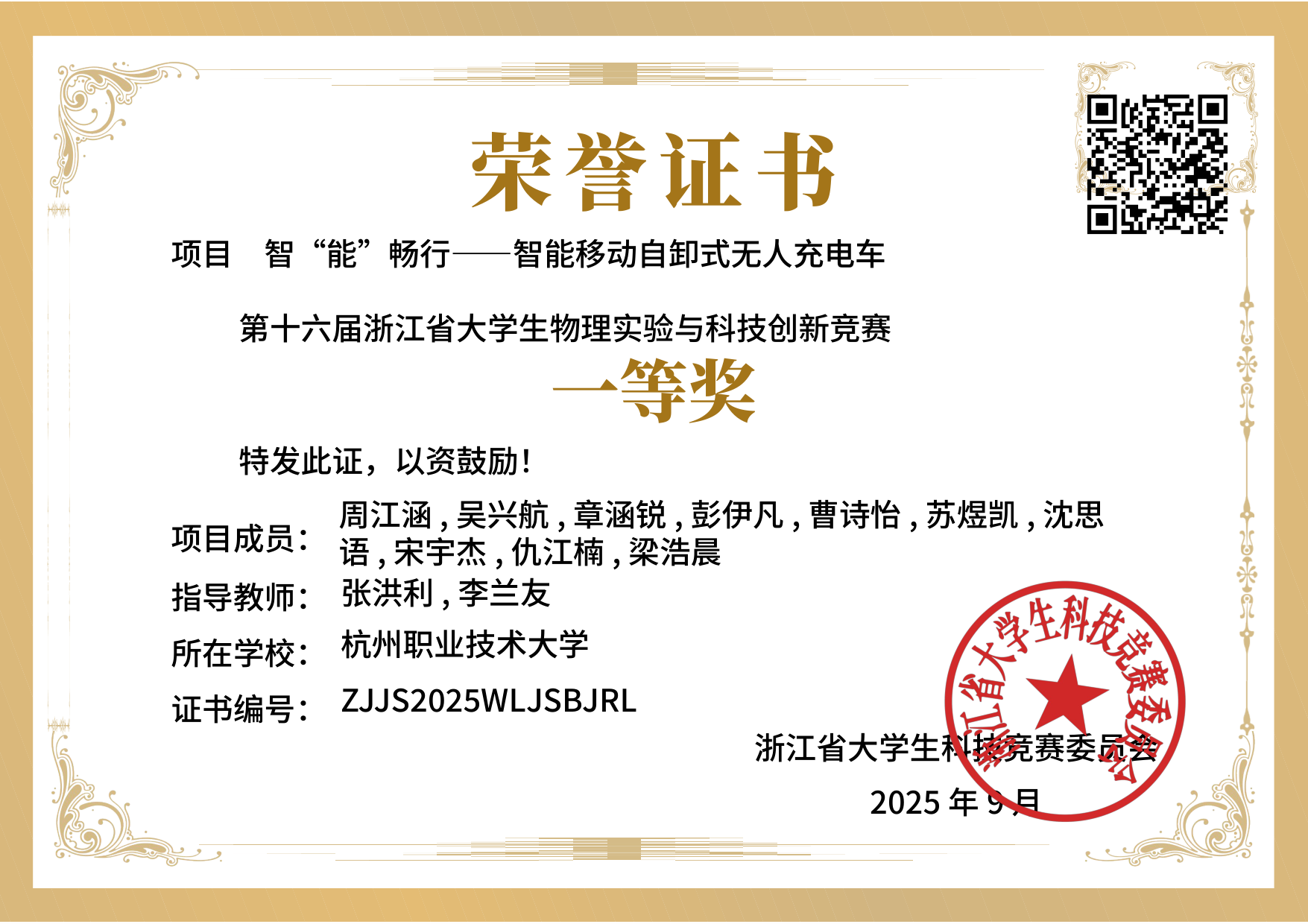 9月25日,浙江省大学生科技竞赛委员会传来喜讯,必赢线路检测3003no1的“智‘能'畅行——智能移动自卸式无人充电车”项目荣获浙江省第十六届大学生物理实验与科技创新竞赛一等奖,“智绘缝将——五轴神工自动化美缝系统”项荣获二等奖,另外还获得三等奖2项,必赢线路检测3003no1张洪利,李兰友两位老师获得“优秀指导教师”荣誉证书。